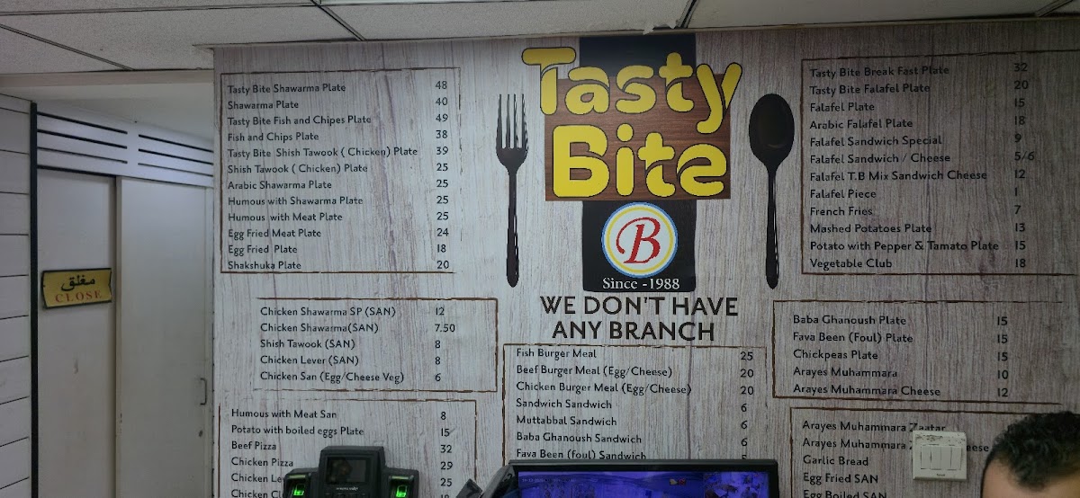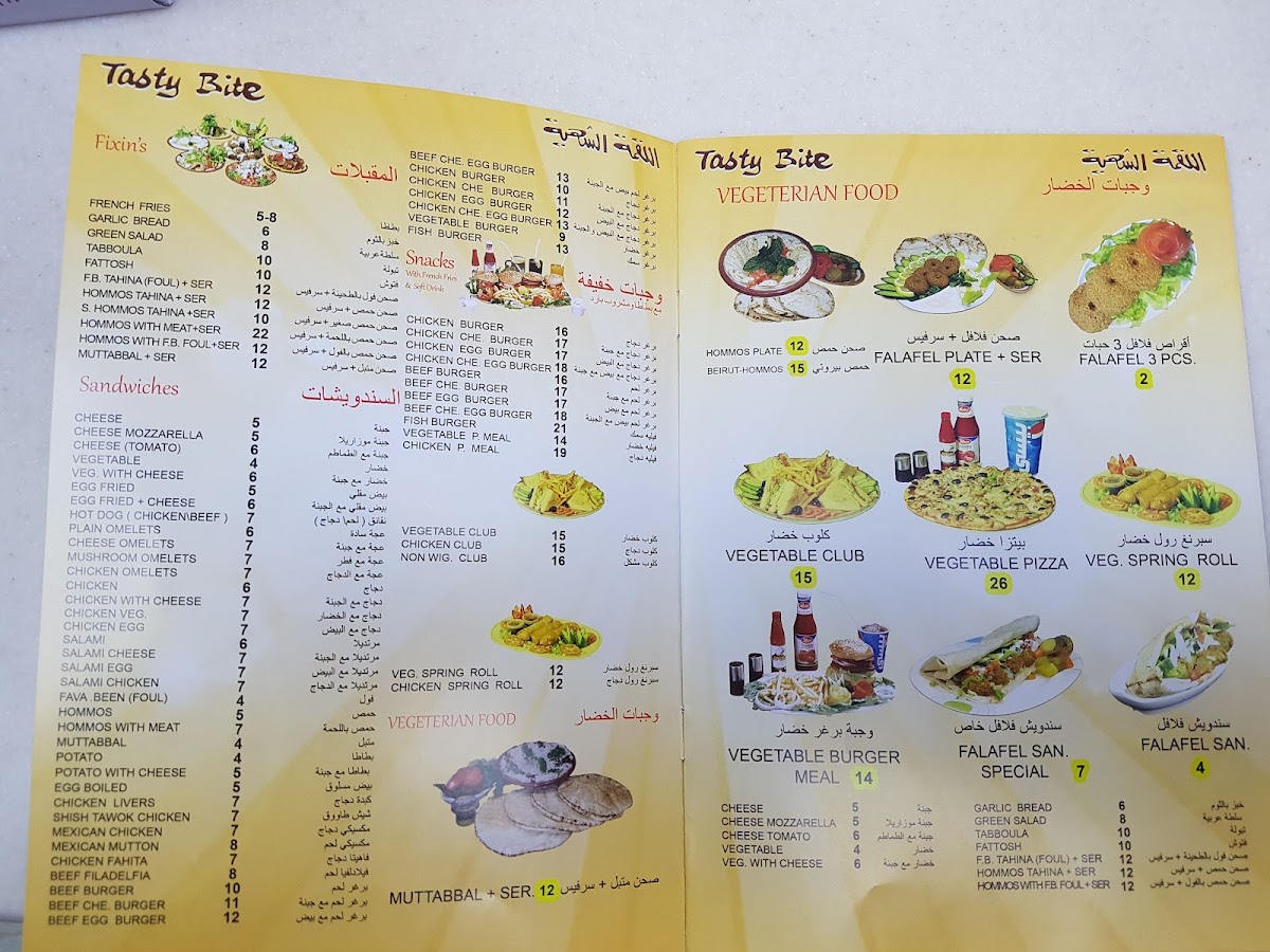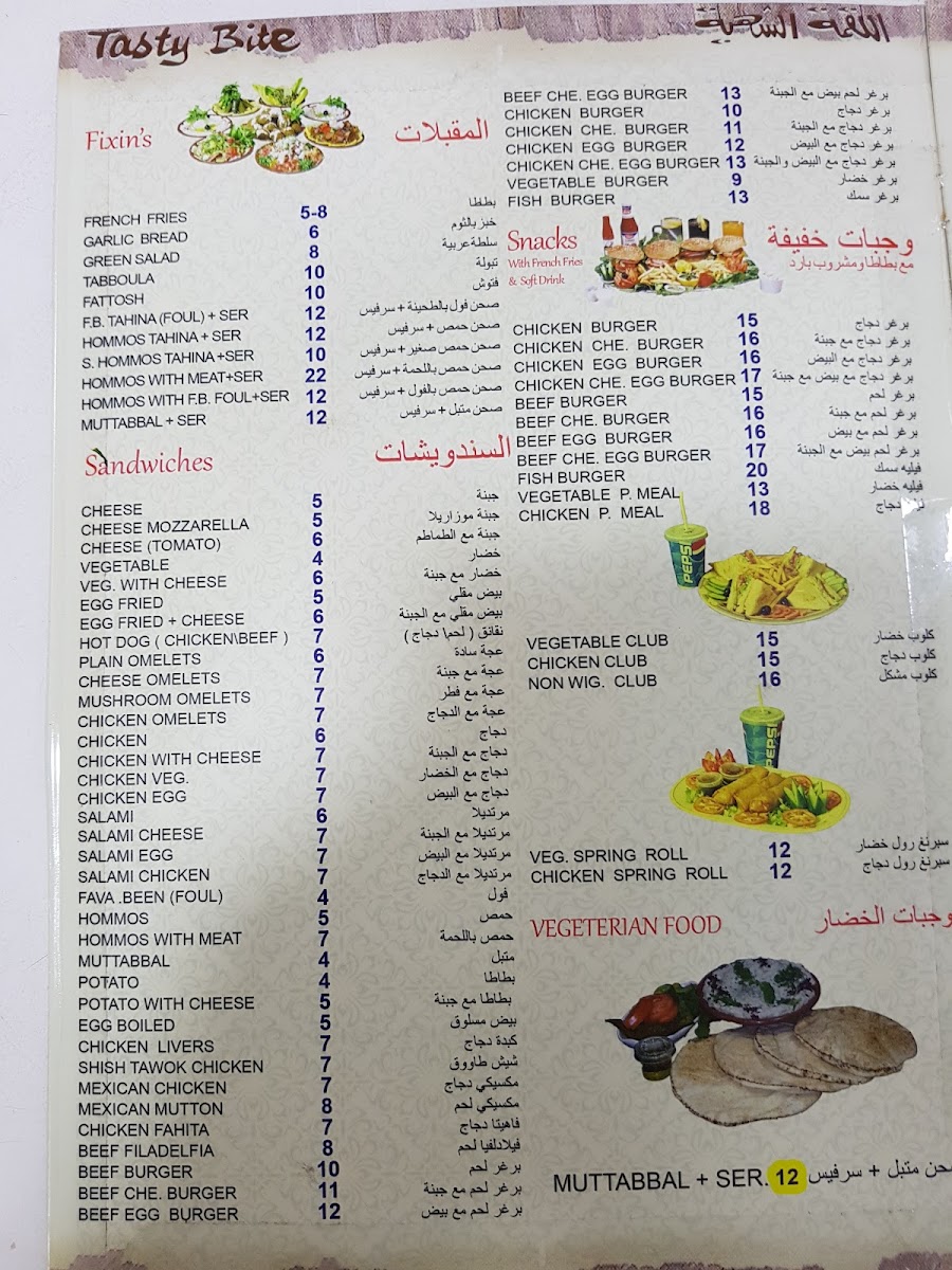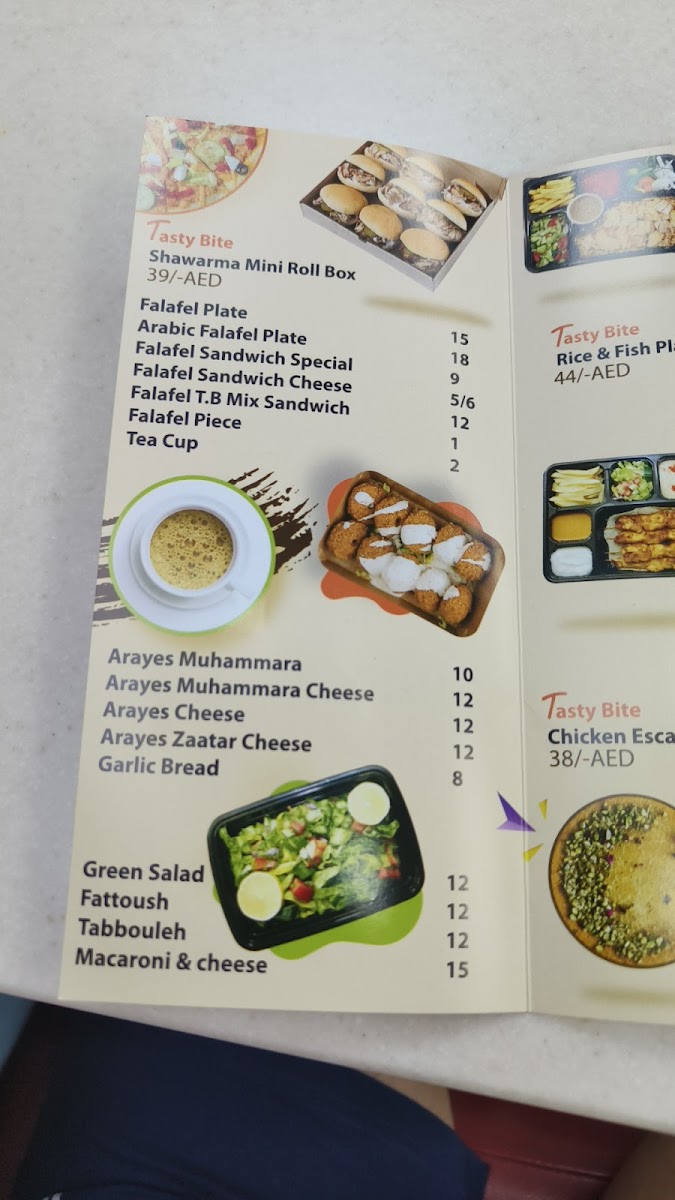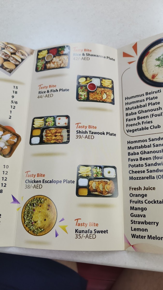Tasty Bite Restaurant offers a delightful menu that brings the rich flavors of the Middle East and beyond to the heart of Dubai. The Falafel Plate stands out as a hearty and satisfying choice, with crispy falafels paired with fresh salad and pita bread. For a quick bite, the Falafel Sandwich is a crowd favorite, offering the perfect balance of crunch and flavor. The Falafels are expertly seasoned, making them a must-try for anyone seeking authentic Middle Eastern street food. Additionally, the Frices Chips and Chicken is a comforting dish, combining crispy fries and tender chicken for a filling meal. For pizza lovers, the Pizza on the menu provides a delicious option, with a perfect blend of toppings. The Humous Beiruti is another highlight, offering a fresh twist on the classic hummus with the addition of herbs and olive oil. For something sweet, the Sitaphal Cream is a unique dessert that delivers a creamy, flavorful finish to any meal. Lastly, the Arabic Shawerma San is a savory favorite, filled with tender meat and wrapped in soft pita, making it the ultimate comfort food. Whether you're in the mood for a light snack or a satisfying meal, Tasty Bite Restaurant's menu is sure to leave you craving more.